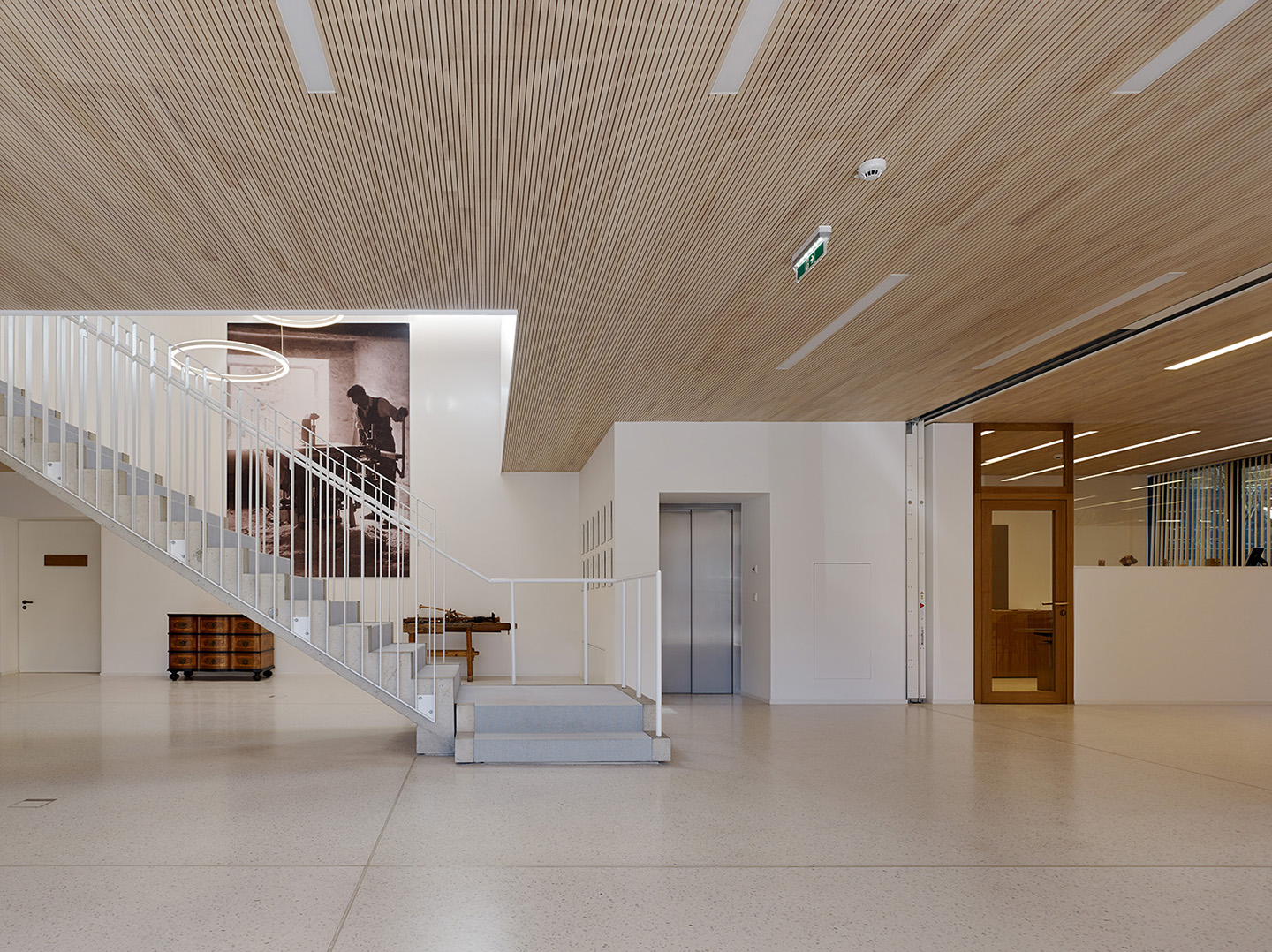 Upon entering the building, one finds themselves in a light-flooded, multistory foyer that also functions as an exhibition area for the manufactured furniture pieces. The combination between the white walls, the bright-grey terrazzo floor and the acoustic ceiling made of silver fir ensures a clear and straightforward ambiance, while also creating an adaptable and versatile space.